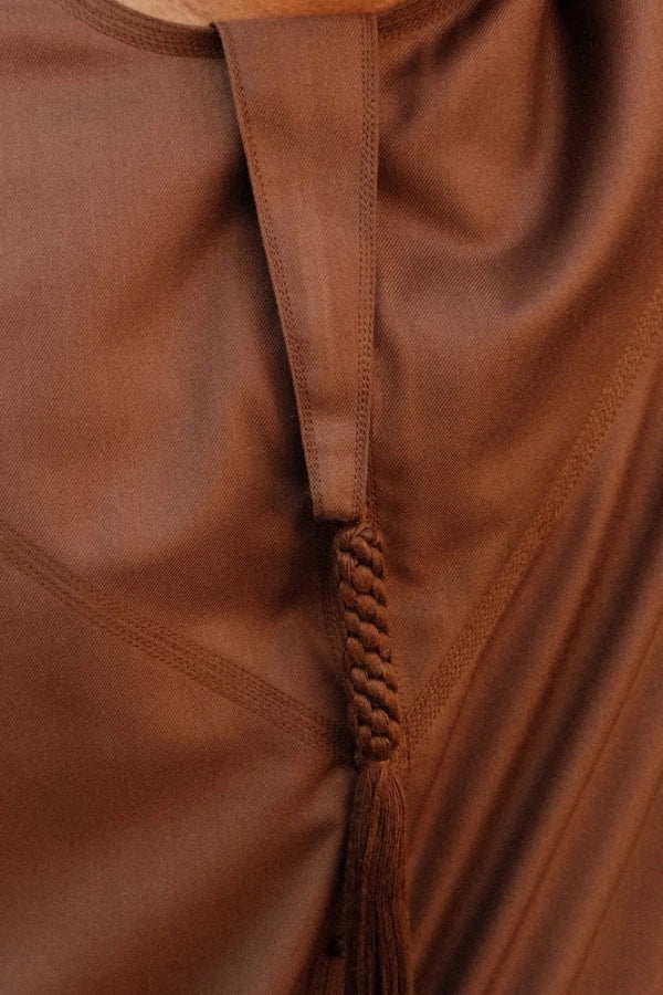 This elegant thobe is a perfect addition to any wardrobe. It has been meticulously hand stitched by our skilled tailors using traditional techniques, ensuring the highest quality and attention to detail. The thobe features a rounded collar and hidden button for a sleek and sophisticated look. The dangling removable tassel with a parallel group of threads adds a touch of uniqueness to the design. Two side pockets provide convenience and functionality.