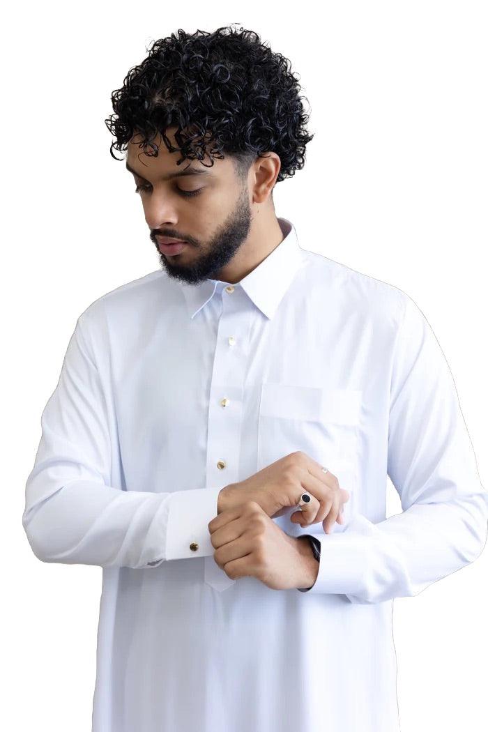 Our Emirati Qamis is embellished with embroidery around the collar, on the...