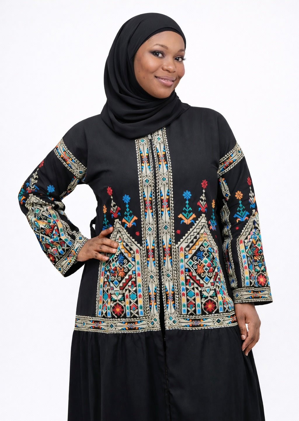 Inspired by classic geometric and floral embroidery, this dress showcases vibrant multicolor detailing along the front panel and sleeves, creating a refined statement piece perfect for both formal and everyday modest wear.