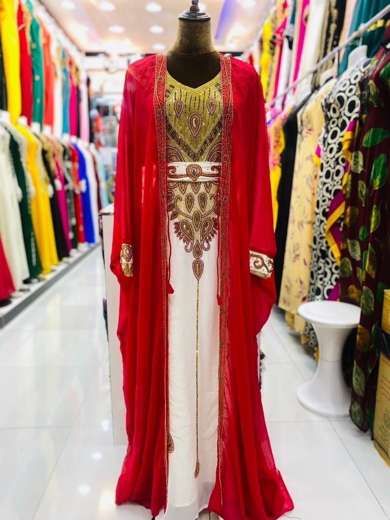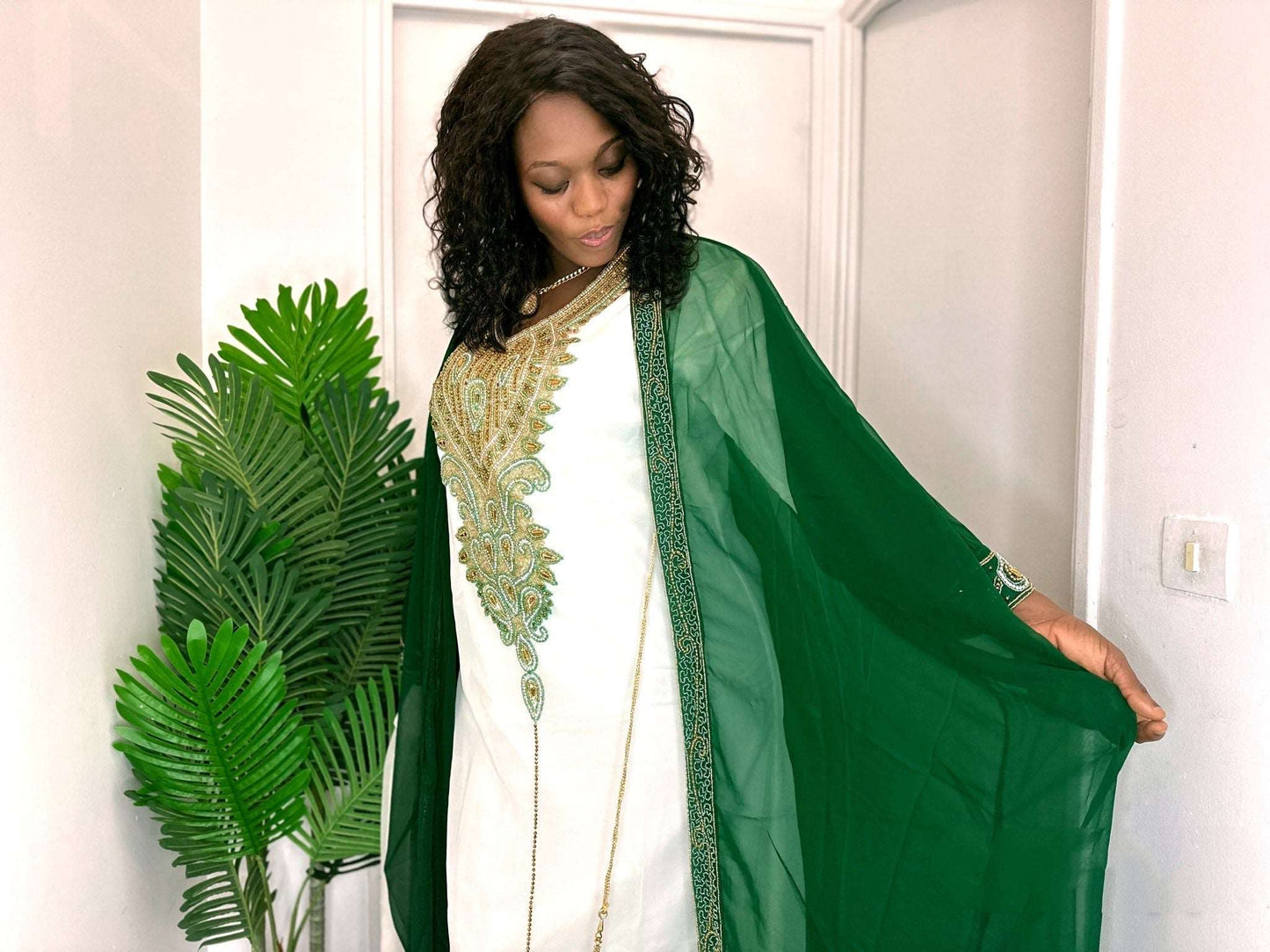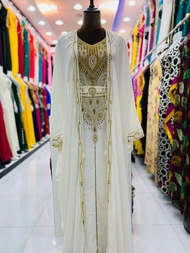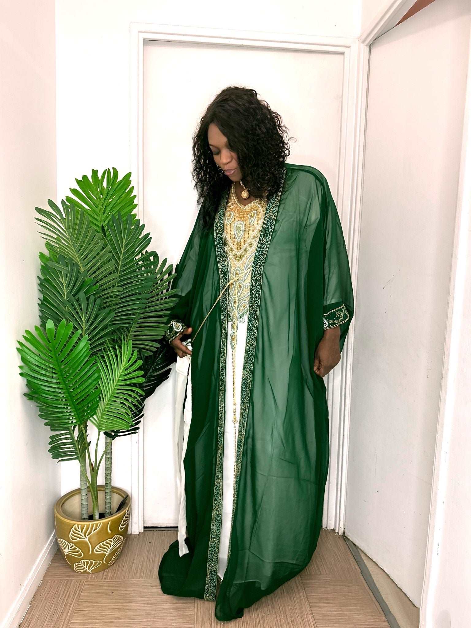 Présentation de notre Cape Kaftan polyvalent et élégant, parfait pour toute occasion. Cet ensemble 3 pièces comprend une cape en voile de soie ornée de strass et cristaux dorés, une robe à manches longues en voile type mousseline doublée également agrémentée de strass dorés, et une ceinture en tissu oriental ornée de strass et de perles pour compléter le look. La cape est fabriquée dans un tissu léger et fluide de type mousseline, ce qui la rend confortable à porter et parfaite par temps chaud. La robe est doublée pour plus de couvrance et la ceinture orientale ajoute une touche de glamour à la tenue. Cet ensemble est disponible dans une taille unique, adaptée à des hauteurs allant jusqu'à 1m75cm.